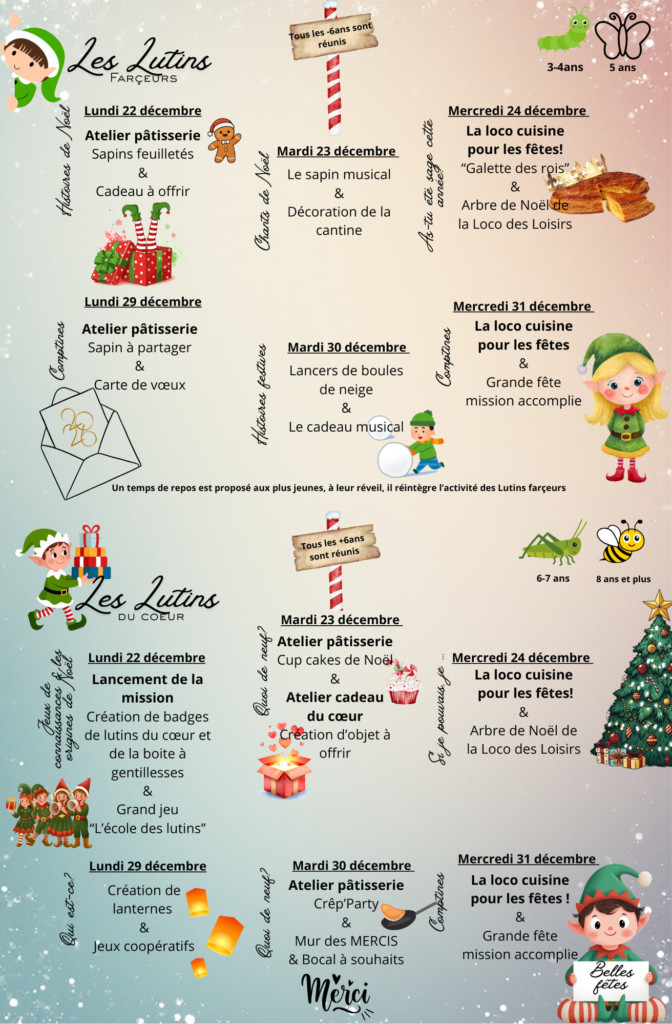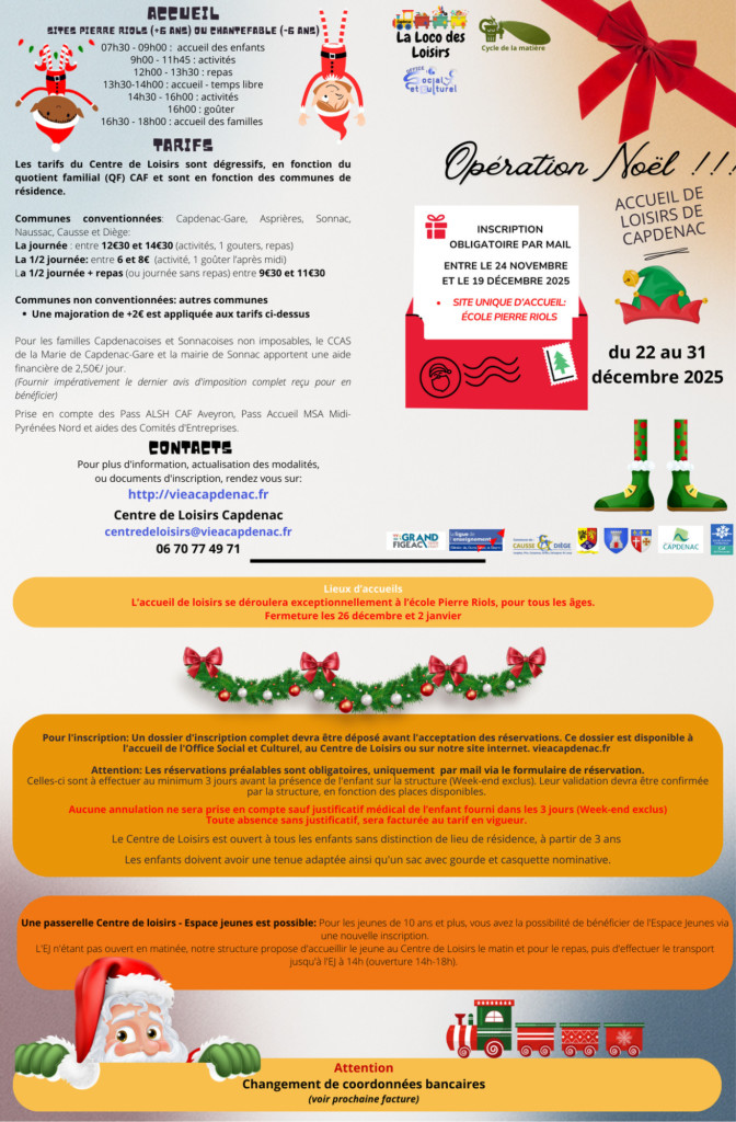 La Loco des Loisirs: Vacance de fin d’année 2025 Posté le 24 novembre 2025 par Office Culturel Capdenac Retrouvez ci dessous le programme des vacances de fin d’année et la fiche de réservations (-6ans et +6ans) à compléter et à retourner à : centredeloisirs@vieacapdenac.fr FICHE DE RESERVATION VACANCES DE FIN D’ANNÉE